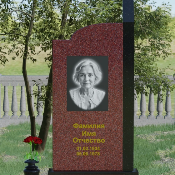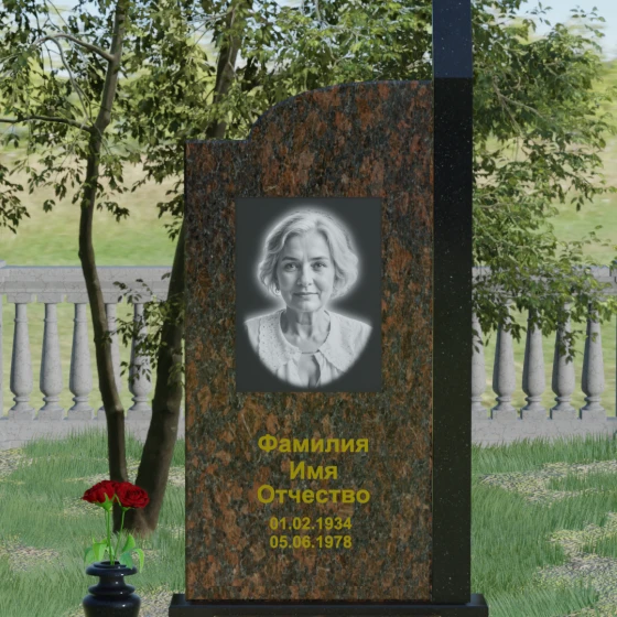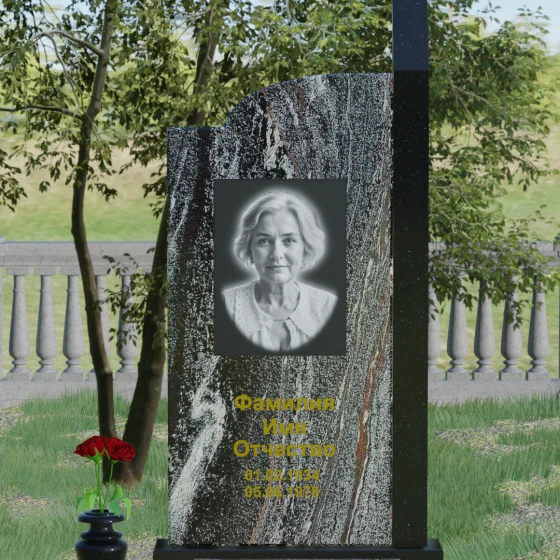 Широкое полотно основной стелы открывает безграничные возможности для художественного оформления. Форма идеально подходит для размещения крупного портрета в технике гравировки с мягкой растушевкой («ореолом»), что создает эффект живого взгляда. Золоченая кириллица имен и дат особенно выразительно смотрится на темном фоне, придавая мемориалу статусность и торжественность. Для того чтобы отразить индивидуальность и характер ушедшего человека, данная модель доступна в 8 цветовых решениях. Вы можете выбрать классический черный гранит Габбро-диабаз, благородный серо-белый Мансуровский гранит, насыщенный красный Лезниковский или глубокий коричневый Дымовский. Также доступны экзотические варианты: лесной Балтик грин, искрящийся Блю Перл, контрастный амфиболит или сияющий белизной мрамор Тассо. Комбинирование двух видов камня позволяет создать уникальный контраст фактур и оттенков, подчеркивая архитектурную сложность изделия.