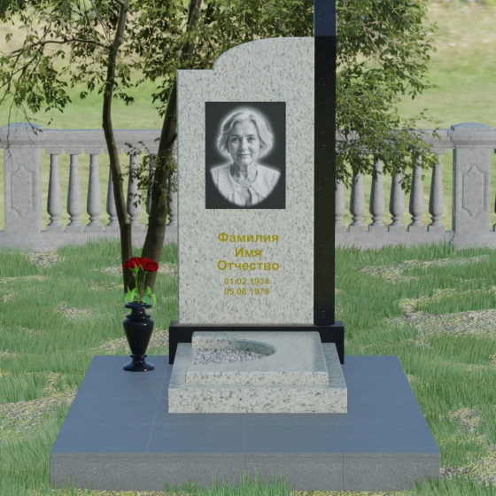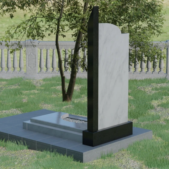 Данная мемориальная композиция представляет собой образец современного архитектурного искусства, где строгая геометрия встречается с мягкой природной грацией. Дизайн изделия построен на эстетике асимметрии: левый край стелы выполнен в виде четкого, волевого «шага», который мгновенно переходит в плавную, нисходящую дугу с правой стороны. Такая форма символизирует баланс между земной твердостью и бесконечным небесным покоем. Вертикальная стела дополнена узким акцентным столпом из контрастного камня, который создает мощную вертикаль, визуально устремляя всю конструкцию ввысь. Тщательно выверенные пропорции позволяют этому монументу органично вписаться в ландшафт любого мемориального комплекса, выделяясь своей лаконичностью и благородством линий.