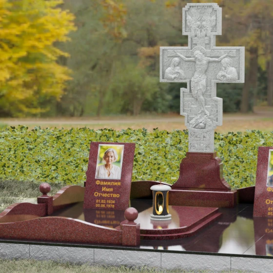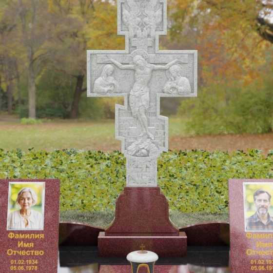 Данный мемориальный ансамбль представляет собой совершенный баланс между духовными традициями и современной архитектурной эстетикой. В центре композиции находится величественная стела в форме высокого православного креста, украшенного детальной многоуровневой резьбой. Барельефное изображение Распятия, выполненное с глубокой проработкой каждой детали — от складок плащаницы до ликов предстоящих, — создает ощущение покоя и благодати. Светлая, матовая фактура резного камня эффектно контрастирует с зеркально отполированными боковыми элементами, предназначенными для увековечивания памяти близких.