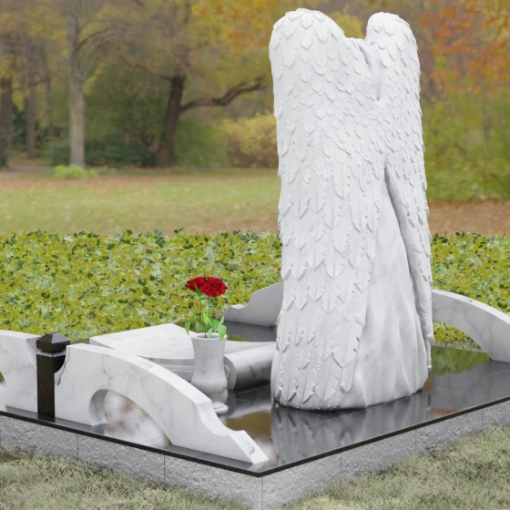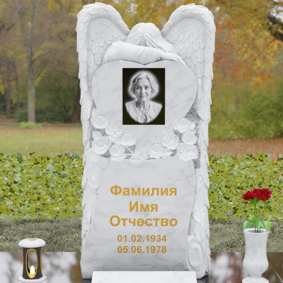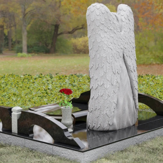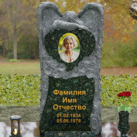 Данная мемориальная композиция представляет собой истинное произведение ритуального искусства, где каждый элемент пропитан глубоким символизмом и благородством. Центральным художественным образом выступает величественная фигура скорбящего ангела, чьи массивные крылья бережно, словно в последней попытке защитить, обрамляют стелу в форме сердца. Мастерство камнереза здесь проявляется в искусной игре контрастов: матовая, детально проработанная фактура оперения крыльев и драпировок одежды небесного покровителя противопоставлена зеркально отполированной глади черного гранита. Именно на этой поверхности, лишенной малейших изъянов, свет преломляется наиболее эффектно, создавая ощущение глубины и монументальности.