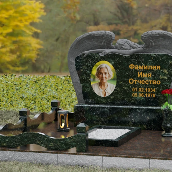 Оформление: Благодаря большой площади горизонтальной плиты, эта модель идеально подходит для размещения крупного художественного портрета и каллиграфических надписей. Мы рекомендуем использовать глубокую гравировку с последующим покрытием сусальным золотом или «под золото», что в сочетании с темными видами гранита подчеркнет статусность и величие монумента.