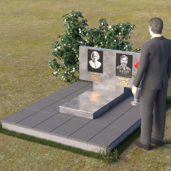 Представленный памятник (артикул ПГ001) являет собой образец строгости и лаконичности, где каждая деталь подчинена общей концепции увековечивания памяти. Композиция состоит из основания, облицованного серыми плитами, горизонтальной плиты, и вертикальной плиты с портретами. Дополнительно предусмотрена тумба для вазы.