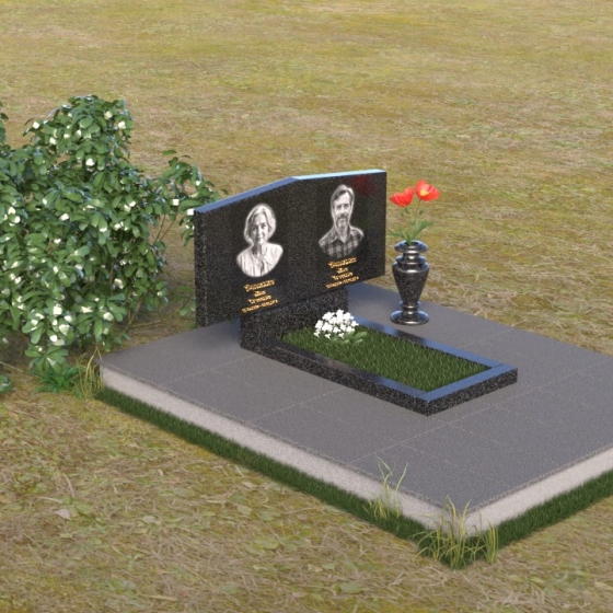 Величественная стела памятника ПГ009 выполнена в строгой, но элегантной форме. Верхняя часть представляет собой слегка асимметричную трапецию со скошенными углами, что придает ей современный и лаконичный вид. Боковые грани стелы отполированы до зеркального блеска, создавая глубокий черный цвет, который служит идеальным фоном для гравировки портретов и надписей. Нижняя часть стелы переходит в горизонтальную плиту, также тщательно отполированную, что создает единую композицию. Эта плита, в свою очередь, венчает небольшую прямоугольную тумбу, выполненную в том же стиле, обеспечивая устойчивость и завершенный вид.