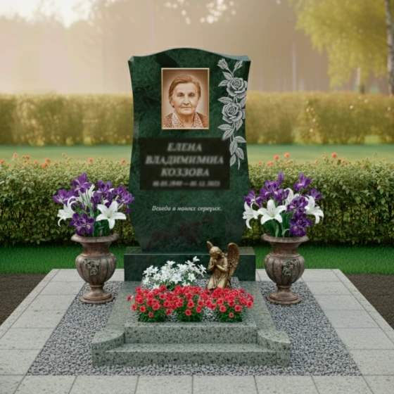Особое внимание привлекает художественная резьба на стеле. Слева, в верхней части, выгравирован портрет усопшей, выполненный с поразительной детализацией. Каждая черточка лица, каждая морщинка передает мудрость и доброту, сохраняя живое выражение. Рядом с портретом, словно обрамляя его, распускается пышная ветвь роз. Их лепестки, вырезанные с невероятной точностью, кажутся объемными и живыми благодаря контрасту между полированной черной поверхностью стелы и матовыми, светло-серыми срезами камня. Эта игра фактур придает цветам изысканную нежность и выразительность. Ниже портрета и роз аккуратно выгравированы имя, фамилия и даты жизни, выполненные строгим, но элегантным шрифтом, который гармонично вписывается в общую композицию. В самом низу стелы, по центру, нанесена лаконичная эпитафия, подчеркивающая глубину чувств.