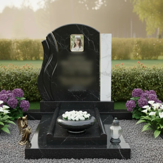 Представленный мемориальный ансамбль, артикул ПН 145, представляет собой гармоничное сочетание классической элегантности и глубокого символизма. Центральная стела выполнена в форме асимметричной арки, где левая сторона плавно изгибается вверх, создавая ощущение легкого, возносящегося движения. Этот изгиб, напоминающий мягкую волну или струящуюся драпировку, придает изделию особую динамику, несмотря на статичность камня. Правая сторона стелы представляет собой строгую, вытянутую вверх колонну, контрастирующую с плавностью левой части и придающую всей композиции устойчивость и величественность. Грани стелы тщательно отполированы до зеркального блеска, что создает завораживающую игру света и тени, подчеркивая глубину черного гранита. В верхней части левой, волнообразной части стелы, расположено овальное обрамление для портрета, выполненное с филигранной точностью и деликатностью. Оно словно заключает в себе лик ушедшего, оберегая его от течения времени. Нижняя часть стелы украшена изящным резным элементом, напоминающим легкую, почти невесомую вуаль, которая лишь подчеркивает общую утонченность дизайна.