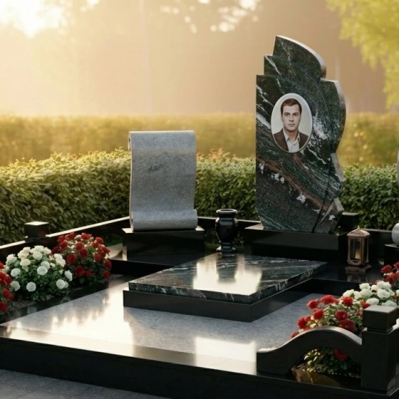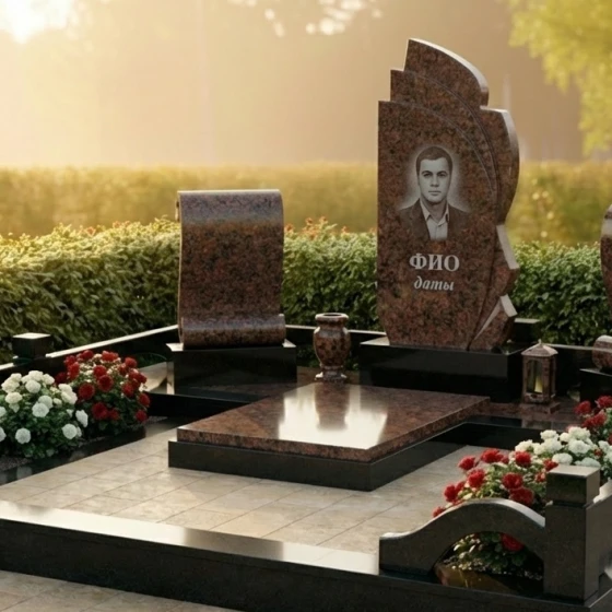 Оформление: Для данной формы монумента идеально подходят как классические, так и современные стили гравировки. Портрет усопшего, выполненный в технике фотогравировки на зеркально отполированной поверхности, будет выглядеть особенно выразительно и реалистично. Рекомендуется размещать портрет в верхней части центральной плиты, а под ним — ФИО и даты жизни, выполненные элегантным шрифтом, который гармонично сочетается с общим стилем монумента. Можно также рассмотреть возможность добавления небольшого символического элемента, такого как ветвь, цветок или крест, в нижней части плиты, чтобы усилить эмоциональное воздействие.