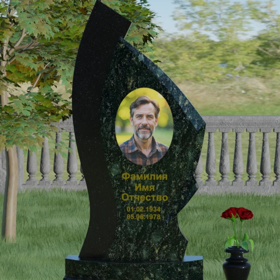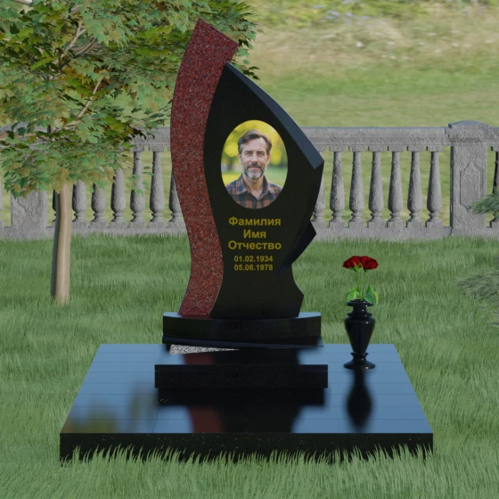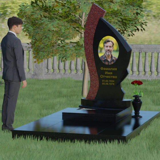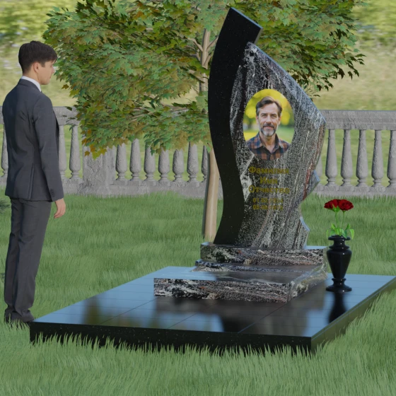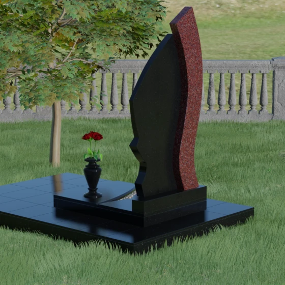 Форма этого памятника глубоко символична. Асимметрия олицетворяет жизненный путь — не всегда ровный, но всегда уникальный. Сочетание двух разных пород камня в одной стеле символизирует неразрывную связь души и тела, земного и вечного. Плавный изгиб верхней кромки напоминает защитное крыло или тихую волну памяти, уносящую печаль, оставляя лишь светлые воспоминания. Этот монумент внушает чувство покоя и защиты, словно оберегая покой ушедшего своей массивной и надежной конструкцией.