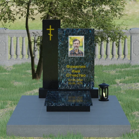 Визуальное решение данного мемориала строится на благородном контрасте двух вертикальных элементов, что позволяет создать глубокий и многогранный художественный образ. Композиция состоит из двух стел разной высоты, установленных внахлест. Более высокая и узкая стела служит духовным стержнем комплекса: на её полированной поверхности закреплен лаконичный православный крест. Его строгие линии и золотистое покрытие подчеркивают святость места и символизируют надежду на вечную жизнь. Широкая основная панель выступает в качестве смыслового центра, где располагается портрет и основные памятные надписи. Использование фотокерамики или портрета на стекле в специальной нише придает образу особую четкость и глубину, гармонируя с зеркальной поверхностью камня.