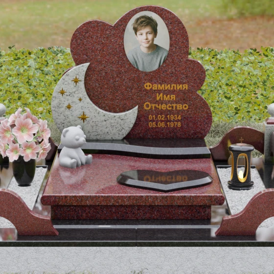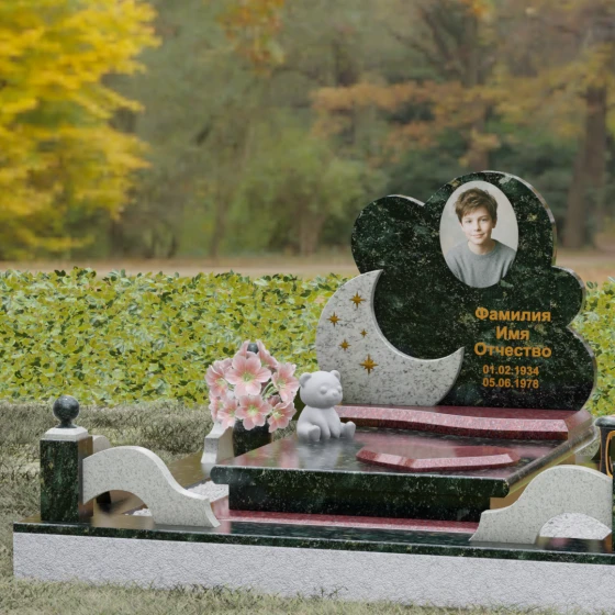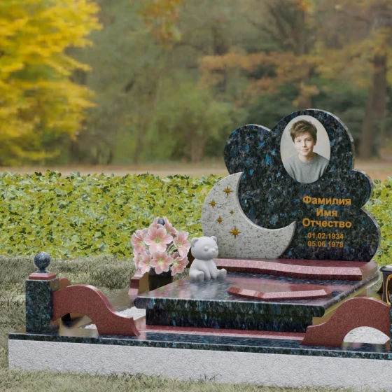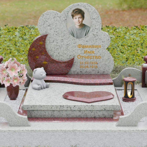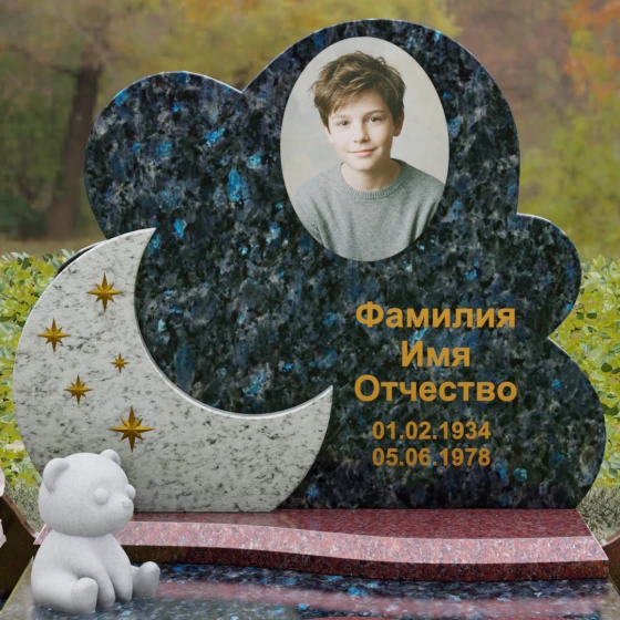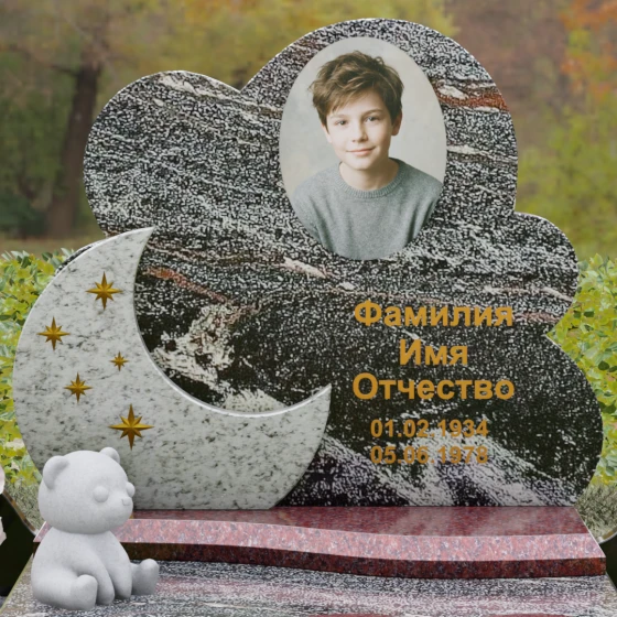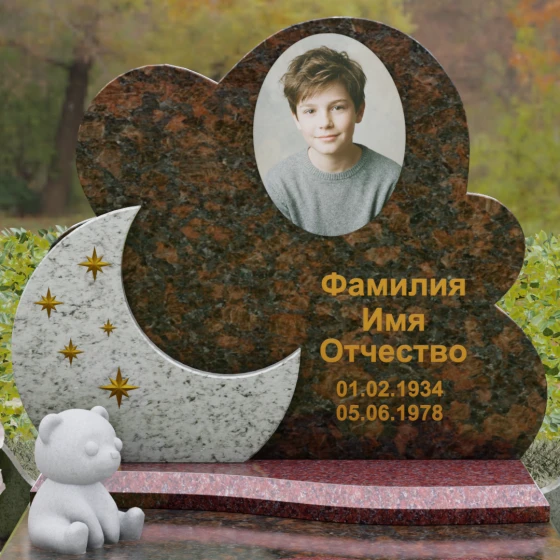 Данная мемориальная композиция — это воплощение нежности, глубокой любви и тихой грусти, застывшей в благородном камне. Выбор такой формы продиктован желанием выразить самые светлые чувства к ушедшему близкому человеку. Силуэт стелы, выполненный в виде мягкого, кучевого облака с плавными, округлыми очертаниями, символизирует покой и вечную жизнь души в небесных сферах. Асимметричная геометрия придает монументу индивидуальность, выделяя его среди строгих прямоугольных форм, и создает ощущение легкости, несмотря на внушительный вес натурального гранита. Особый акцент сделан на игре фактур и цветов: основная часть монумента из темного камня гармонично сочетается со вставкой из светлого гранита в форме изящного полумесяца. На этом светлом фоне выгравированы лаконичные золотые звезды, которые словно освещают путь памяти через десятилетия.