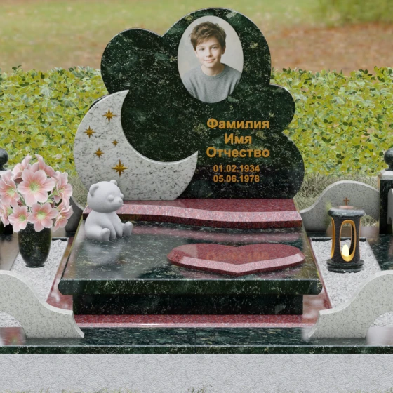 Дополнительные аксессуары, такие как изящная гранитная ваза для живых цветов и закрытая лампада, выполнены в единой цветовой гамме с основной стелой, создавая целостный архитектурный ансамбль. Углы участка акцентированы декоративными столбиками с навершиями в виде шаров, что придает периметру строгость и защищенность. Особенным, трогательным элементом является скульптура маленького медвежонка из светлого камня, установленная у подножия — этот символ чистоты и невинности привносит в мемориальную композицию ноту особой душевной близости.
