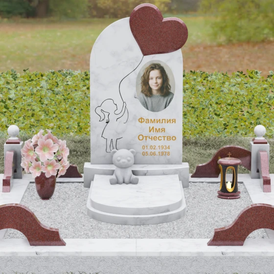 Представленная мемориальная композиция — это не просто надгробие, а глубокое художественное высказывание, в котором застыло мгновение нежности и вечной связи. Основная стела выполнена в форме изящной асимметричной арки из глубокого черного гранита. Главным акцентом ансамбля выступает объемное сердце из насыщенного красного камня, которое словно парит в воздухе, подобно легкому воздушному шару. Тонкая, едва уловимая линия резьбы соединяет этот символ любви с рукой выгравированного силуэта маленькой девочки. Мастерски исполненная гравировка ребенка с хвостиком, тянущегося вверх, придает всей конструкции невероятную легкость и трогательность. Игра контрастов здесь возведена в абсолют: зеркальная полировка черного обелиска соседствует с ярким цветом сердца, создавая эффект трехмерного пространства и визуального объема.