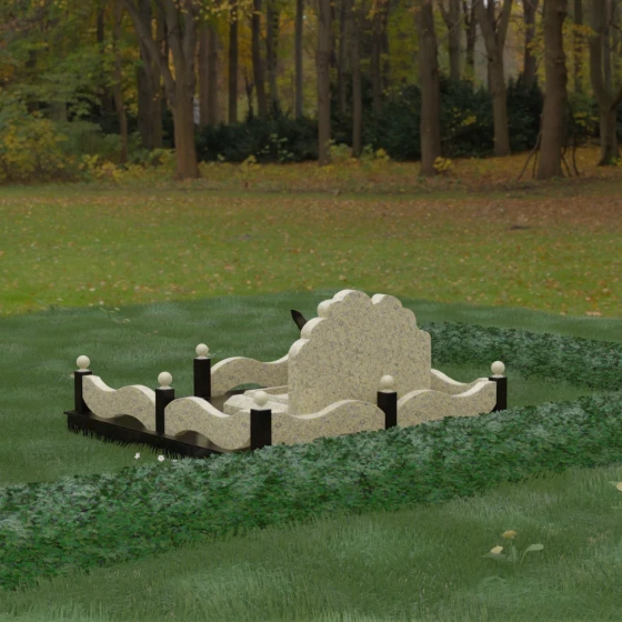 Данная мемориальная композиция представляет собой величественный ансамбль, в котором строгость камня смягчается плавностью природных линий. Выбор горизонтальной формы стелы продиктован стремлением создать ощущение покоя, стабильности и масштабности. Главным акцентом изваяния служит искусно выполненный силуэт истребителя, который словно устремляется ввысь на фоне резного навершия, напоминающего кучевые облака. Эта деталь превращает надгробие в персональный трибьют человеку, чья жизнь была неразрывно связана с небом, высотой и долгом перед Отечеством. Плавная волна верхнего края стелы гармонично перекликается с формой ограждения, создавая единое визуальное пространство, наполненное глубоким смыслом и уважением к памяти ушедшего.