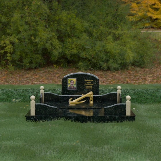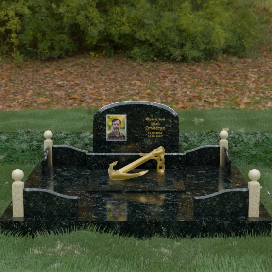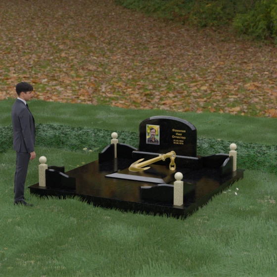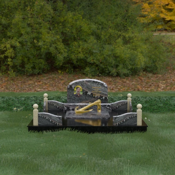 • Центральный символ: На надгробной плите расположен объемный декоративный элемент в виде золотого якоря с массивной цепью. Этот символ олицетворяет надежду, твердость характера и профессиональный путь, связанный со стихией, становясь смысловым центром всего мемориала.