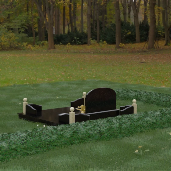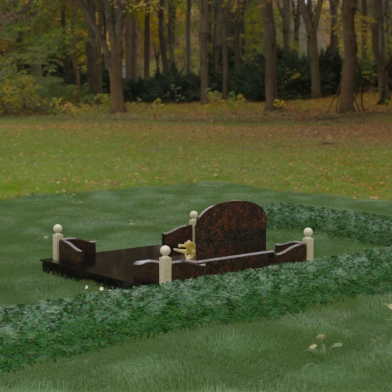Представленная мемориальная композиция — это не просто дань уважения, а монументальное художественное произведение, воплощающее в камне идею незыблемости, надежности и вечного пристанища. В центре ансамбля расположена величественная вертикальная стела с мягким арочным завершением, чьи формы напоминают небесный свод. Геометрия изделия продумана до мелочей: строгие линии основания гармонично сочетаются с плавными изгибами боковых ограждений, создавая визуальный баланс между земной тяжестью камня и духовной легкостью формы. Особый акцент сделан на игре фактур — зеркальная, глубокая полировка лицевых поверхностей контрастирует с благородной матовостью резных элементов, подчеркивая природную красоту и глубину натуральной породы.