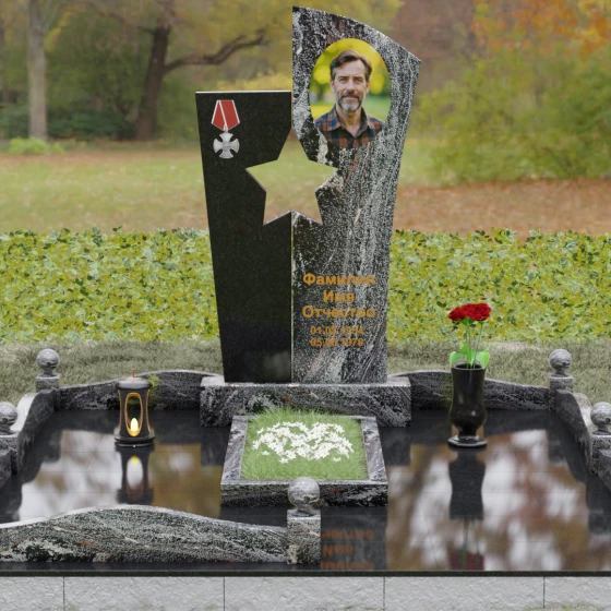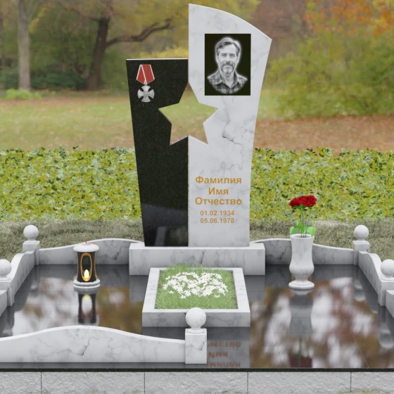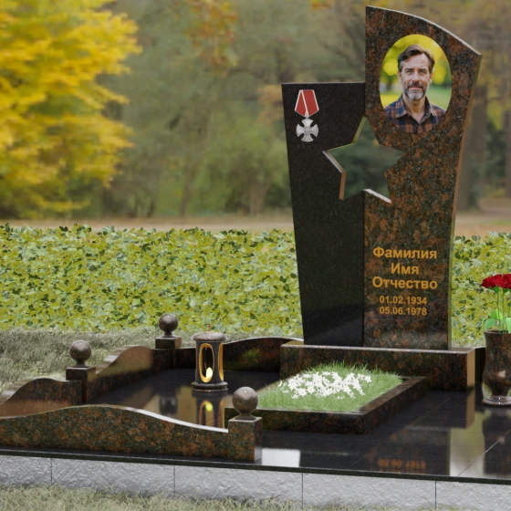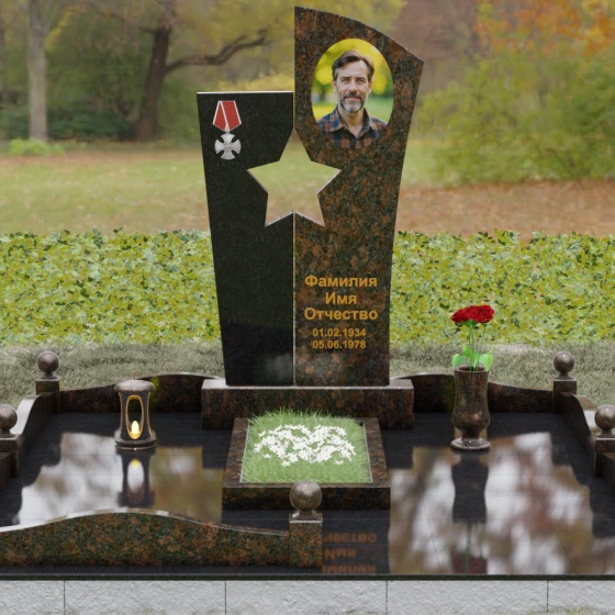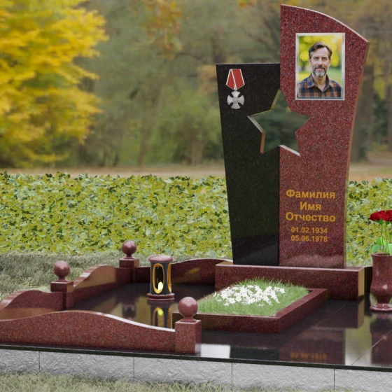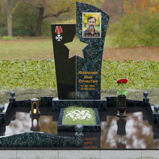 Оформление: Для данной модели рекомендуется использование высокохудожественной лазерной или ручной гравировки портрета на темном полотне камня. Золочение букв эпитафии идеально дополнит образ звезды и ордена, создавая торжественный и статусный вид. Широкое поле правого блока позволяет разместить не только даты жизни, но и важные слова, которые останутся в камне навсегда.