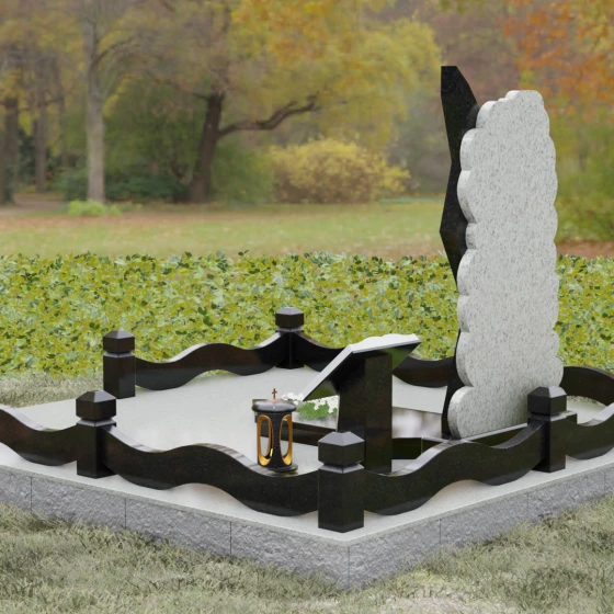 Модель «Артикул 188» представляет собой сложную архитектурную композицию, построенную на эффектном контрасте форм и материалов. Центральная стела выполнена в асимметричном стиле: основная часть из темного гранита имеет строгую вертикальную направленность с резким, устремленным ввысь навершием. Левая грань стелы украшена четырьмя четкими диагональными ступенчатыми вырезами, которые придают памятнику динамику и подчеркивают твердость характера усопшего. Эта темная плита словно «вырастает» из обрамления из светлого камня, край которого обработан в виде мягких, пушистых облаков или морской пены.