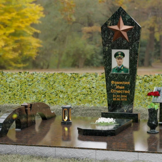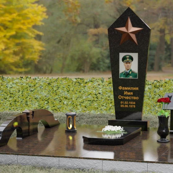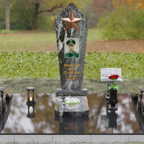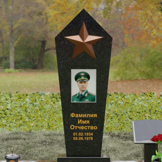В верхней части стелы расположена объемная пятиконечная звезда, выполненная в технике накладного рельефа. Она является главным смысловым акцентом, контрастируя по цвету и фактуре с зеркальной поверхностью основного камня. Ниже расположен прямоугольный портрет на керамической основе, интегрированный в плоскость стелы с безупречной точностью. Завершает художественный образ гравировка текста, выполненная глубоким шрифтом с золочением, что обеспечивает читаемость надписей на десятилетия вперед.