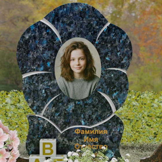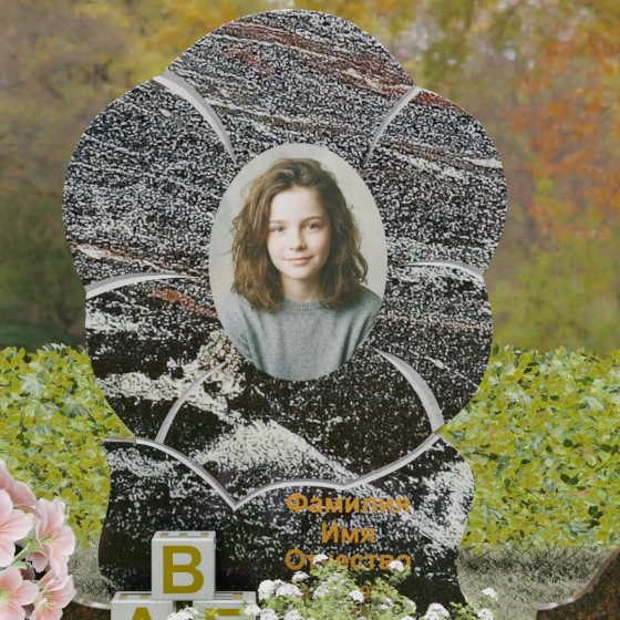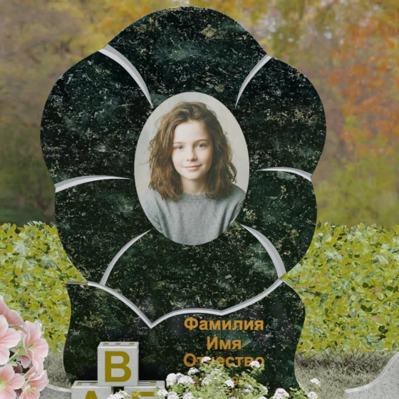 Центральный элемент композиции выполнен в виде стилизованного раскрывшегося цветка, чьи очертания напоминают нежную фиалку или анютины глазки. Форма изваяния базируется на пяти мягких, округлых лепестках, которые создают естественную раму для овального портрета. Особое внимание архитектор уделил игре текстур: поверхность камня подвергнута глубокой зеркальной полировке, в которой отражается небо, в то время как границы лепестков обозначены изящной светлой резьбой. Эти матовые V-образные фаски создают необходимый объем и графичность, выделяя лепестки на темном фоне камня. Нижняя часть центрального элемента плавно переходит в асимметричный волнообразный постамент, на котором золоченой гравировкой нанесены памятные надписи, идеально гармонирующие с общим стилем.