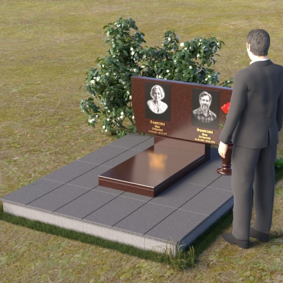 Это ритуальное изделие представляет собой гармоничное сочетание прямых линий и мягких, едва уловимых изгибов, создающих ощущение покоя и умиротворения. Стела имеет прямоугольную форму, но ее верхняя грань слегка скошена, что придает ей визуальную легкость и динамику. Обратите внимание на зеркальную полировку лицевой стороны – она отражает небо и окружающий мир, словно заключая в себе вечность. На полированной поверхности выгравированы портреты усопших и памятные надписи, выполненные с высокой точностью и детализацией. Слева от стелы, на основании, располагается небольшая горизонтальная плита с аналогичной полировкой, создающая дополнительное пространство для цветов или памятных предметов. Основание памятника выполнено из серого камня с матовой фактурой, что создает контраст с блестящей стелой и придает композиции устойчивость и завершенность. Рядом с плитой установлена ваза, выполненная из того же черного полированного гранита, что и стела, что обеспечивает единство стиля и служит достойным обрамлением для живых цветов, символизирующих вечную память.