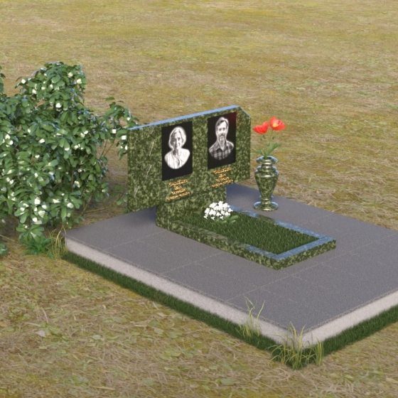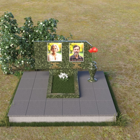 В верхней части памятника располагается вертикальная стела прямоугольной формы с небольшими скошенными углами, придающими ей более мягкий и благородный вид. На поверхности стелы размещены два портрета усопших, выполненные с высокой детализацией. В левом верхнем углу вырезано изображение православного креста, выполненного в лаконичном стиле, подчеркивающем сдержанность и глубину веры. Справа от портретов вырезана изящная роза с детально проработанными лепестками, символизирующая любовь и вечную память. Нижняя часть стелы плавно переходит в горизонтальную плиту, на которой размещается табличка с именами и датами жизни усопших. Горизонтальная плита, в свою очередь, опирается на строгий постамент, обеспечивающий устойчивость всей конструкции.