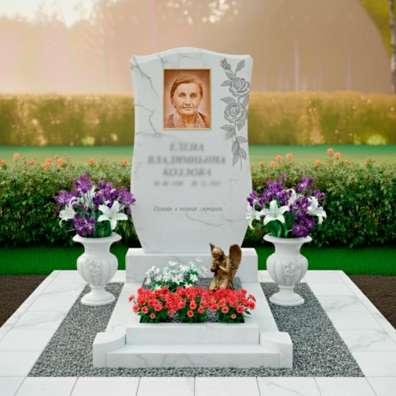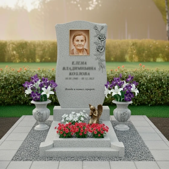 Благоустройство участка продумано до мелочей, создавая завершенный и ухоженный вид. Стела установлена на массивный, но при этом изящный гранитный цоколь, который надежно фиксирует конструкцию и придает ей устойчивость. Цоколь выполнен из черного гранита с тщательно отполированными гранями, что создает единый ансамбль со стелой. Надгробная плита, уложенная по всему периметру цоколя, выполнена из светлых гранитных плит, создающих контраст с основным камнем и облегчающих уход за местом захоронения. По периметру плиты уложена мелкая гранитная крошка, которая придает участку аккуратный и благородный вид. Композицию дополняют две массивные каменные вазы, расположенные по бокам от стелы. Их классическая форма и темный цвет идеально сочетаются с гранитом, а пышные букеты из фиолетовых и белых лилий, словно живые, привносят нотку свежести и нежности. В центре, перед стелой, размещена небольшая гранитная площадка, на которой установлена изящная бронзовая статуэтка ангела, склонившегося в молитве, и высажены яркие красные цветы, символизирующие вечную любовь и память.