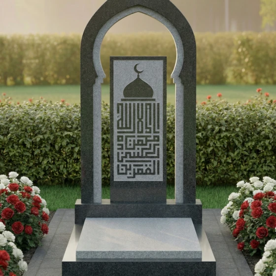 Представляем вашему вниманию модель памятника ПН 506 – это не просто надгробие из натурального камня, а истинное произведение искусства, призванное увековечить светлую память о близком человеке с глубоким почтением и достоинством. Каждая линия, каждый изгиб этого монумента пронизан смыслом и гармонией, создавая ощущение вечности и спокойствия. Центральная стела выполнена в форме изящной арки, напоминающей вход в священное место или портал в иной мир. Ее грани тщательно обработаны, создавая плавные переходы от полированных, зеркальных поверхностей к матовым, словно слегка припорошенным временем, срезам камня. Эта игра контрастов черного и серого гранита придает монументу невероятную глубину и объем, позволяя свету скользить по камню, подчеркивая его благородную текстуру. Внутри арки расположена прямоугольная вставка из светлого гранита, на которой выгравирована сложная каллиграфическая композиция, увенчанная полумесяцем и звездой – символами ислама. Эта гравировка выполнена с поразительной детализацией, где каждый элемент орнамента и каждая буква прорисованы с ювелирной точностью, создавая эффект кружевного узора, который кажется вырезанным из самого камня. Благодаря контрасту светлой гравировки на темном фоне, надпись читается легко и выразительно, притягивая взгляд и приглашая к размышлениям.