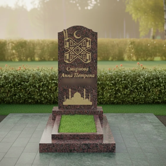 Данная мемориальная композиция под артикулом 722 представляет собой образец высокого художественного мастерства, где каждая линия пропитана уважением к традициям и духовности. Центральная стела выполнена в классической вертикальной форме с изящным навершием, напоминающим очертания купола мечети или арку священных врат. Плавный изгиб верхней грани придает монументу завершенность и гармонию, смягчая строгость натурального камня. Безупречная зеркальная полировка лицевой стороны создает глубокий, почти мистический блеск, на фоне которого особенно эффектно смотрятся элементы художественной резьбы.