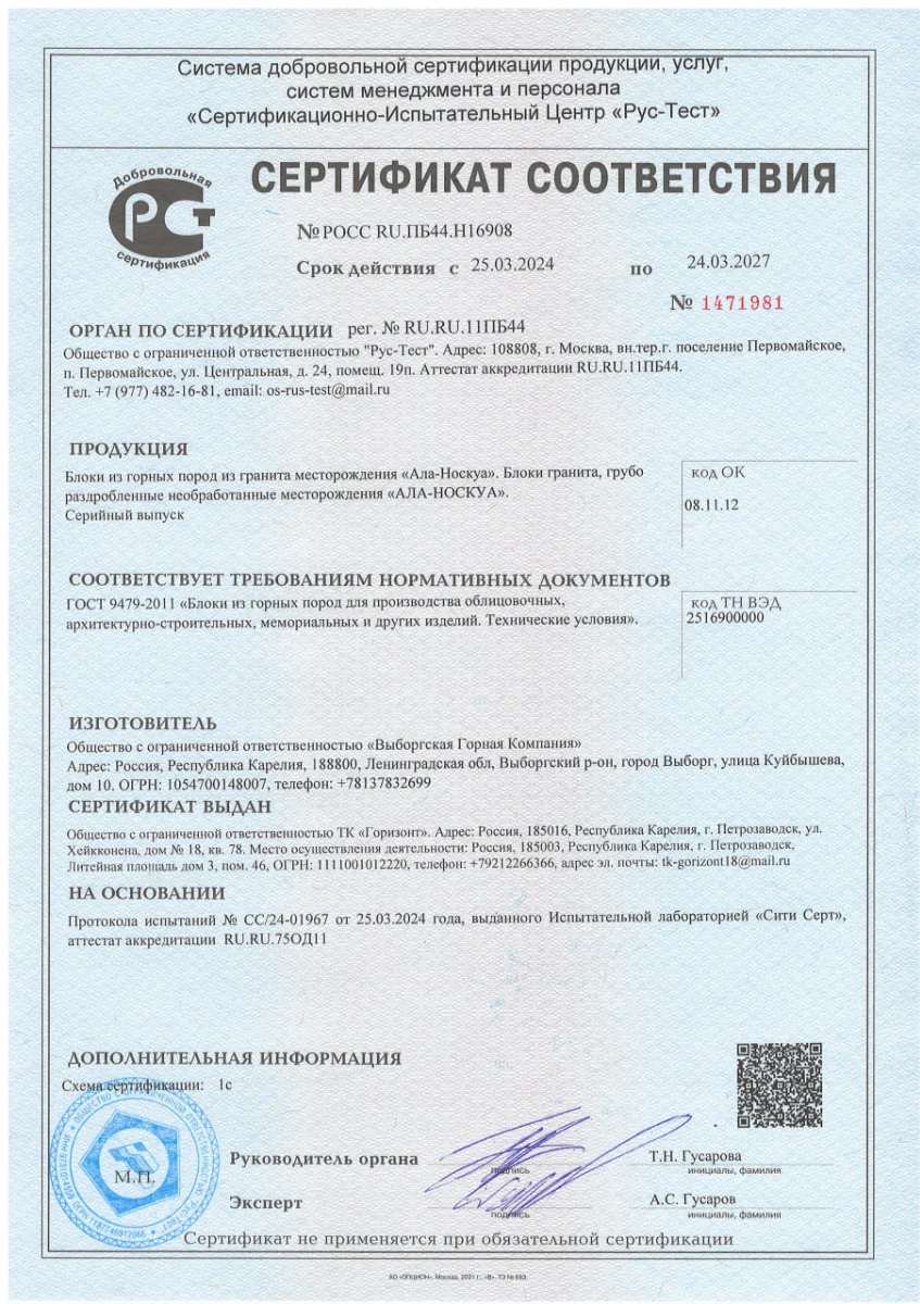 Мы хотим, чтобы вы были абсолютно уверены в качестве и безопасности материала, из которого будет изготовлен памятник для ваших близких. Поэтому мы публикуем сертификаты соответствия на основные виды гранита, которые мы используем в работе.